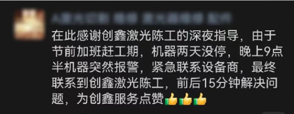 *更多客戶好評無法一一展現(xiàn),在此感謝所有創(chuàng)鑫客戶對創(chuàng)鑫產(chǎn)品和服務(wù)的認(rèn)可。