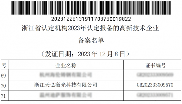 2023年12月28日,高新技術企業(yè)認定管理工作網(wǎng)發(fā)布了《對浙江省認定機構2023年認定報備的高新技術企業(yè)進行備案的公告》,浙江天弘激光科技有限公司通過2023年度“高新技術企業(yè)”認證。這是浙江天弘激光2020年成立后首次通過國家級高新技術企業(yè)認定,也是繼天弘激光蘇州總部復審通過2023年高新技術企業(yè)認定后的,又一殊榮。