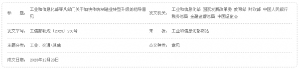 工業(yè)和信息化部等八部門(mén)關(guān)于加快傳統(tǒng)制造業(yè)轉(zhuǎn)型升級(jí)的指導(dǎo)意見(jiàn)工信部聯(lián)規(guī)〔2023〕258號(hào)各省、自治區(qū)、直轄市及計(jì)劃單列市、新疆生產(chǎn)建設(shè)兵團(tuán)工業(yè)和信息化主管部門(mén)、發(fā)展...