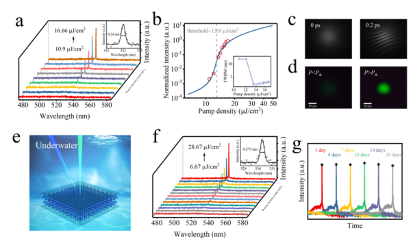 a、亞波長垂直腔激光輸出光譜;b、激光輸入輸出圖;c、激光干涉圖;d、激光輸出光斑圖;e、水下激光示意圖;f、水下激光輸出光譜;g、20天水下激光穩(wěn)定輸出