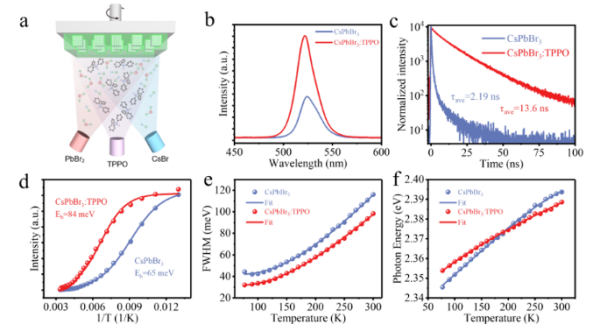a、三源共蒸示意圖;b、鈣鈦礦熒光光譜;c、熒光壽命;d-f、溫度依賴的熒光光譜的發(fā)光強度、半高寬和峰位置圖