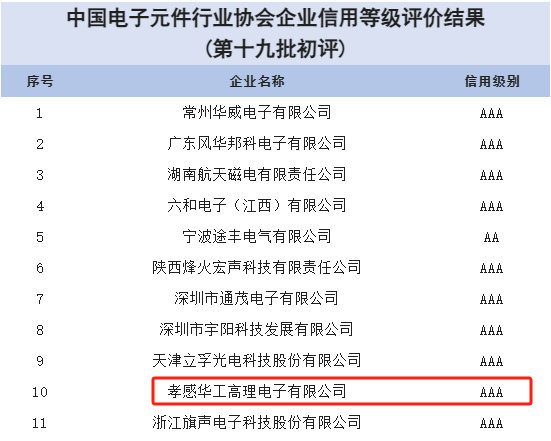 1月22日,中國電子元件行業(yè)協(xié)會發(fā)布了第十九批中國電子元件行業(yè)企業(yè)信用等級評價結(jié)果。華工科技核心子公司華工高理獲評“企業(yè)信用評價AAA級信用企業(yè)”。