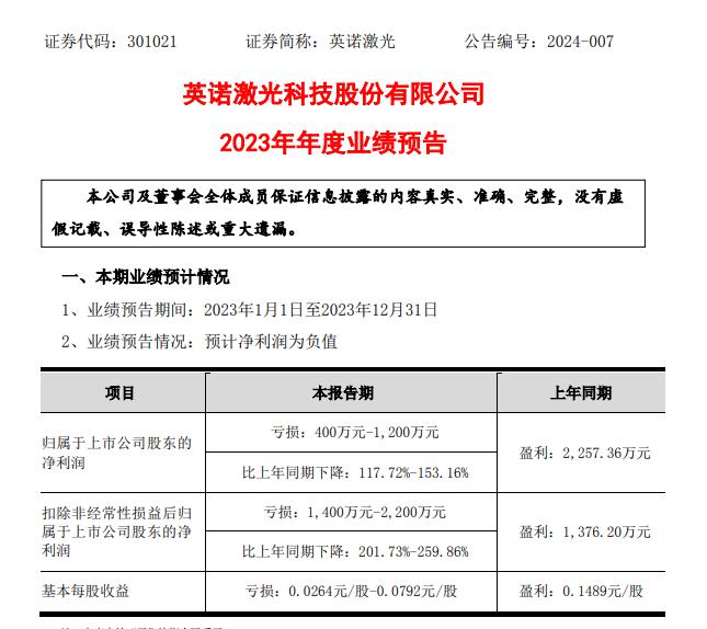 樂居財經(jīng) 趙盼盼 1 月 31 日,英諾激光 ( 301021.SZ ) 發(fā)布 2023 年度業(yè)績預(yù)告公告。