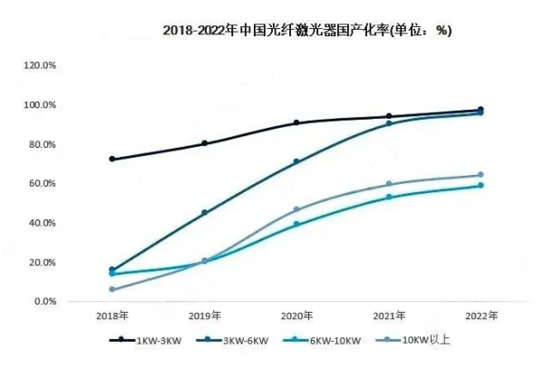 根據(jù)中國科學院武漢文獻情報中心發(fā)布的數(shù)據(jù),從市場滲透率來看,在1-3KW功率段光纖激光器市場,2022年國產(chǎn)光纖激光器市場份額達97.3%,已基本實現(xiàn)國產(chǎn)化;在3-6KW功率段光纖激光器市場,國產(chǎn)激光器滲透率由2018年的15.8%迅速提升至2022年的95.7%;在6-10KW功率段光纖激光器市場,2022年國產(chǎn)滲透率達到58.6%。