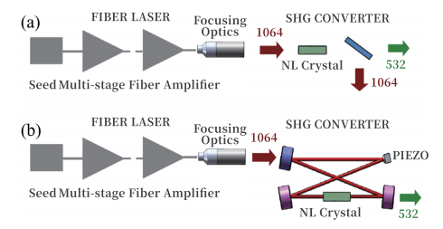 圖2 (a)單通倍頻和(b)外腔諧振倍頻綠光激光器光路示意圖[4]