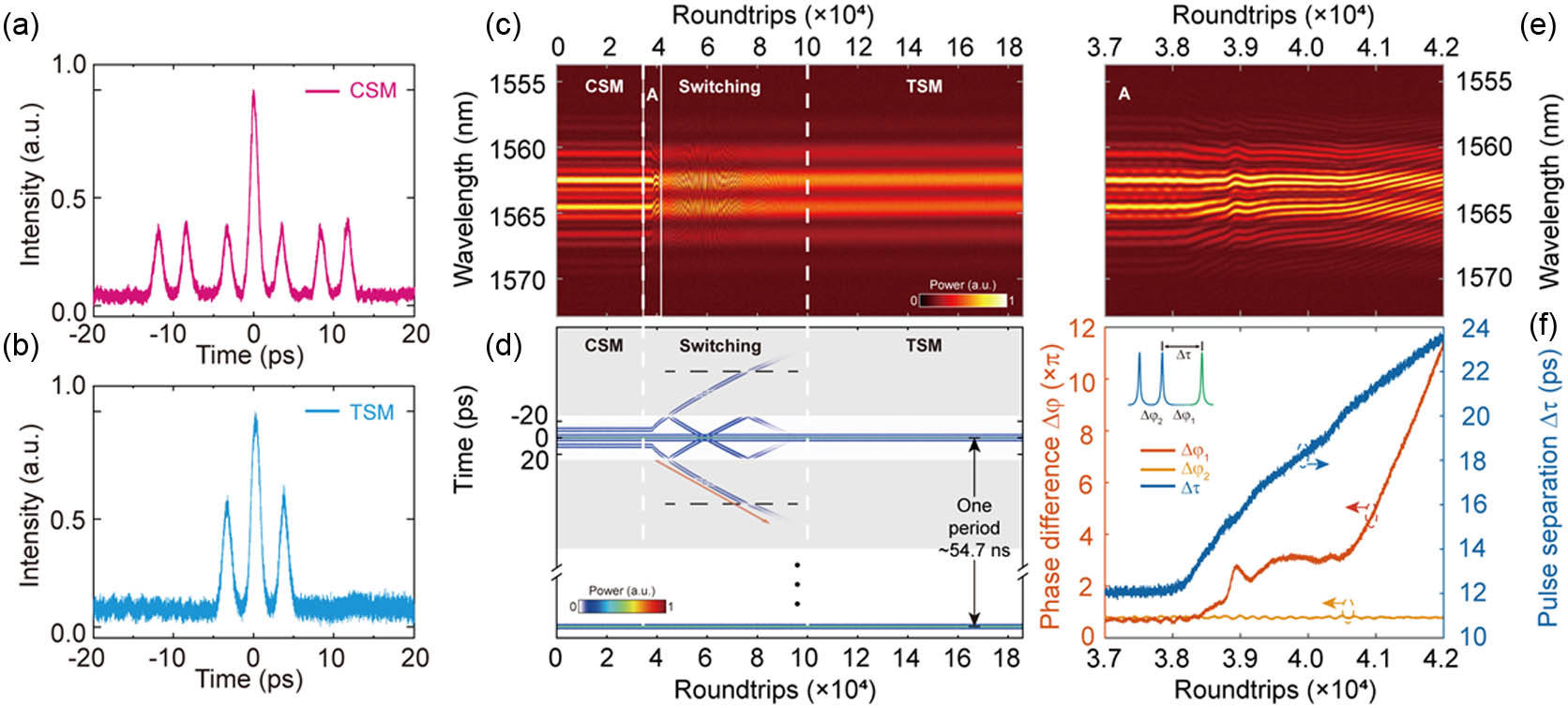 實(shí)驗(yàn)上,團(tuán)隊(duì)通過光譜濾波實(shí)現(xiàn)了全局范圍內(nèi)的增益調(diào)控,成功觀察到耗散孤子的形成及演變?nèi)^程。特別是在孤子形成后,通過可調(diào)諧濾波器,可以進(jìn)一步驅(qū)動(dòng)多個(gè)孤子的相互作用,實(shí)現(xiàn)“孤子分子”的合成和解離。整個(gè)調(diào)控過程完全可逆,反映出系統(tǒng)內(nèi)光學(xué)增益對(duì)于孤子狀態(tài)的相干調(diào)控作用。