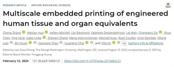 近日,大連理工大學機械工程學院趙丹陽教授課題組和美國內華達大學雷諾分校機械工程系Yifei Jin課題組等團隊合作,針對多尺度復雜組織/器官體外精準制造這一長期困擾生物打印領域的難題,提出了多尺度浸入式打印策略(Multiscale Embedded Printing,MSEP),實現(xiàn)了多尺度人體組織和器官的體外制造,從而有效驗證了MSEP技術在構建復雜人體組織和器官方面的巨大潛力。該研究成果以“工程人體組織和器官等效物的多尺度浸入式打印”(Multiscale embedded printing of engineered human tissue and organ equivalents)為題發(fā)表于美國國家科學院官方學術期刊《美國國家科學院院刊》(Proceedings of the National Academy of Sciences ,PNAS)。