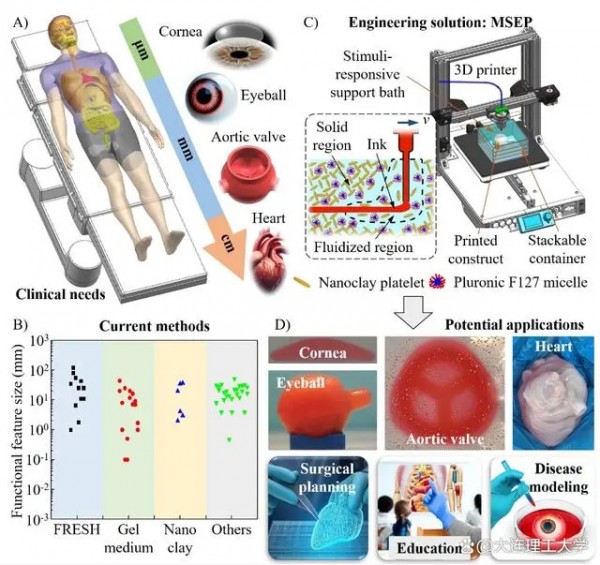 MSEP技術采用刺激響應型屈服應力流體作為支撐浴,該支撐浴由溫敏性水凝膠Pluronic F127和屈服應力添加劑納米粘土組成,同時具有溫敏性和屈服應力特性,可在打印過程中快速添加并在室溫下提供穩(wěn)定支撐?;贛SEP技術,本研究提出了一種動態(tài)層高控制策略,實現(xiàn)了具有微米級表面粗糙度的工程角膜結構的3D打印。同時,利用MSEP技術制造了具有毫米級特征尺寸的異質人類眼球和主動脈瓣模型,以及具有分米級尺度的全尺寸人體心臟模型。該研究成果為多尺度人體組織和器官的精準制造提供了新的方法和可能性,為未來的組織工程研究和人造器官移植奠定了重要的技術基礎。