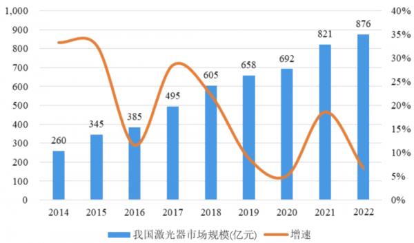 2.1.1中國激光器市場規(guī)模達876億元,占據(jù)全球市場過半份額