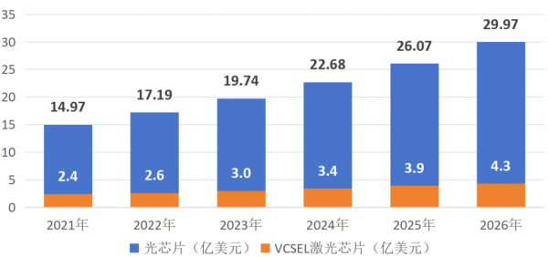 光芯片與光通信和光模塊密不可分。根據(jù)億渡數(shù)據(jù),2021年我國光芯片市場規(guī)模達14.97億美元,2015-2021年復(fù)合增長率達14.94%,預(yù)計2026年我國光芯片市場將增長至29.97億美元。其中VCSEL激光芯片的需求不斷擴大,2021年我國VCSEL芯片市場規(guī)模約為2.4億美元,占據(jù)光芯片市場的約15%,預(yù)計至2026年,我國VCSEL芯片市場規(guī)模將增長至4.3億美元。
