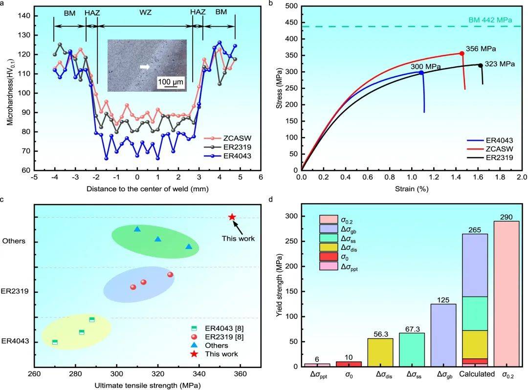 焊接接頭在無熱處理的條件下平均抗拉強度為349 MPa,達到2024-T4態(tài)高強鋁合金熔化焊接目前公開文獻報道的最優(yōu)水平?;趶娀瘷C制,定量分析了細(xì)晶強化、第二相強化、位錯強化和固溶強化對力學(xué)性能的貢獻,發(fā)現(xiàn)細(xì)晶強化是導(dǎo)致力學(xué)性能提高的主要原因,為接頭強度提高貢獻47%。