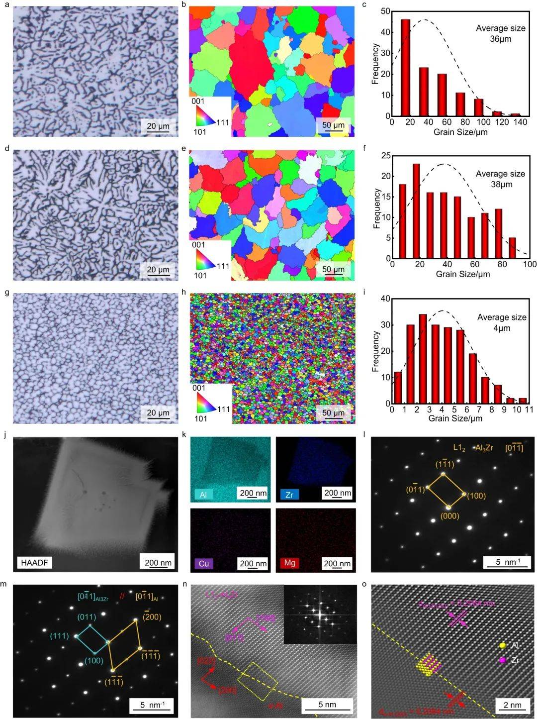 利用超景深光學(xué)顯微鏡、EBSD和TEM等多種表征方法,分析了焊縫截面的微觀結(jié)構(gòu)特征,發(fā)現(xiàn)焊縫內(nèi)部為均勻細(xì)小的非枝晶等軸晶組織,平均晶粒尺寸僅為4 μm,這種超細(xì)等軸晶組織的形成能夠有效抑制凝固裂紋缺陷。進一步闡明了含鋯形核相(Al3Zr)與母相(α-Al)完全共格的晶體學(xué)匹配關(guān)系,揭示了熔池凝固過程中超細(xì)等軸晶的異質(zhì)形核機制。