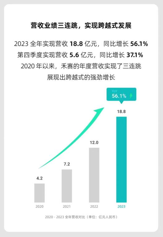 3 月 12 日,禾賽科技(HSAI.US)公布了 2023 年第四季度及全年未經(jīng)審計(jì)的財(cái)務(wù)數(shù)據(jù)。財(cái)報(bào)顯示,2023 年禾賽營收為 18.8 億元,同比增長 56.1%,累計(jì)交付激光雷達(dá)超 30 萬臺(tái)。