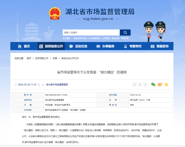 “湖北精品”是湖北省內(nèi)市場主體生產(chǎn)、提供、建設(shè)的達(dá)到國內(nèi)先進(jìn)標(biāo)準(zhǔn)、質(zhì)量穩(wěn)定可靠、創(chuàng)新能力突出、社會信譽(yù)良好,按規(guī)予以認(rèn)定的產(chǎn)品、服務(wù)和工程,每年組織認(rèn)定一次?!昂本贰迸嘤袆邮巧钊雽嵤┵|(zhì)量強(qiáng)省、品牌強(qiáng)省戰(zhàn)略的重要舉措,旨在推動形成一批達(dá)到國內(nèi)先進(jìn)標(biāo)準(zhǔn)、質(zhì)量穩(wěn)定可靠、創(chuàng)新能力突出、社會信譽(yù)良好的“湖北精品”品牌群體。