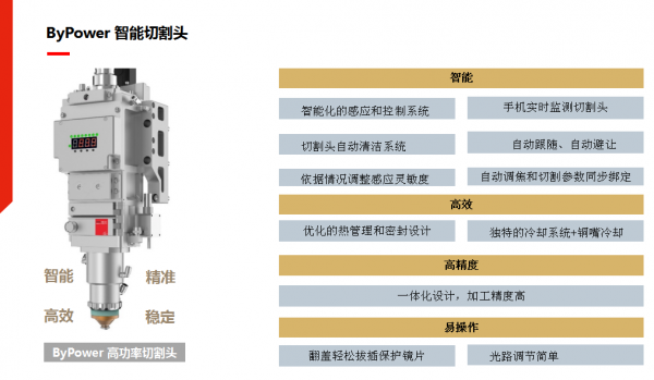 而ByPower切割頭堪稱智能、精準(zhǔn)、高效、穩(wěn)定的集大成者。它展現(xiàn)了高度智能化,擁有智能化的感應(yīng)與控制系統(tǒng),可實(shí)時(shí)通過手機(jī)監(jiān)測切割頭狀態(tài),更配備了自動(dòng)清潔系統(tǒng)、自動(dòng)跟隨與避讓功能,能根據(jù)具體情境靈活調(diào)整感應(yīng)靈敏度,實(shí)現(xiàn)自動(dòng)調(diào)焦與切割參數(shù)同步綁定,盡顯智慧之光。在高效性方面,切割頭通過優(yōu)化的熱管理與密封設(shè)計(jì),結(jié)合獨(dú)特的冷卻系統(tǒng)與銅嘴冷卻技術(shù),確保了卓越的工作效率。而在精準(zhǔn)度上,其一體化設(shè)計(jì)保證了加工精度之高超,令人嘆為觀止。此外,其操作簡便易行,翻蓋式設(shè)計(jì)使得保護(hù)鏡片的插拔變得輕松自如,光路調(diào)節(jié)亦是簡單直觀,讓使用者得心應(yīng)手。
