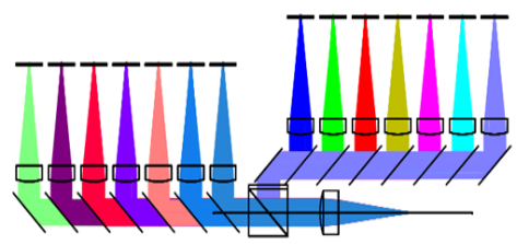采用激射波長相同或相近的激光單元進行光束整形,空間合束、偏振合束以及光纖合束,是多個不同波長激光合束的基礎??臻g合束是將多束激光空間堆疊,增加功率的同時光束質量變差; 偏振合束利用半導體激光線偏振特性,將兩束振動方向相互垂直的光束通過偏振合束鏡,實現光束重合的方式輸出,功率提高近一倍,光束質量不變。