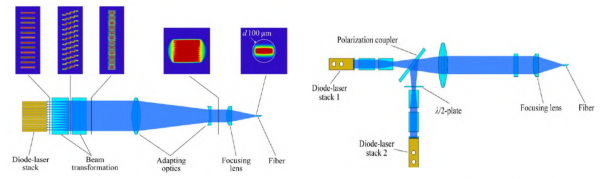 疊陣合束光源基于微通道水冷疊陣,采用高功率厘米激光巴條,需先對光斑整形后才能合束,單層激光疊陣輸出功率可達50-75W,采用數十層疊陣合束,可實現數百瓦至上千瓦功率從300~800μm光纖輸出,也可作為直接光源應用。通過波長擴展,可將功率提升至更高。德國Laserline公司在該技術領域具有優(yōu)勢,采用高亮度的激光bar, 通過棱鏡堆光束整形,推出了500到4KW激光器產品。