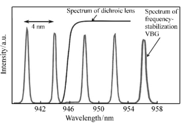 常規(guī)合束方式的相鄰波長間隔很難于25 nm,在430nm到492nm藍光波長,采用粗波長合束,合束波段最多不超過3線??紤]合束過程中的損耗以及430nm、490nm附近的芯片效率損耗,激光功率及亮度提升有限。因此采用密集光譜合束,是藍光半導體激光提高輸出亮度的一條可行的路徑。