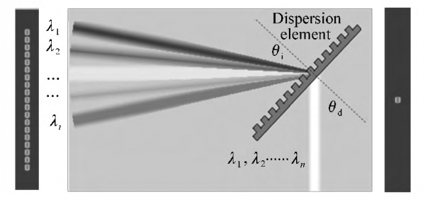 光譜合束技術利用單片色散元件可同時實現多束波長間隔低至 0. 1 nm的激光合束,進一步提高合束單元數量,其原理如圖16所示,多束不同波長的激光分別以不同角度入射到色散元件,并在色散元件處重合,然后在元件色散作用下沿相同方向衍射輸出,各光束在近場和遠場均相互重疊,獲得功率為單元光束之和而光束質量與單元光束一致的合束激光輸出。為了實現窄間隔光譜合束,通常采用色散強的衍射光柵作為合束元件。