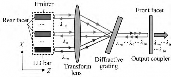 面光柵結合外腔鏡反饋無須對激光單元光譜進行獨立控制,難度及成本明顯降低,也是目前實現高功率、高亮度半導體激光輸出的最佳方案之一。是實現目前高性能光譜合束的主要方式,其原理如圖17所示。