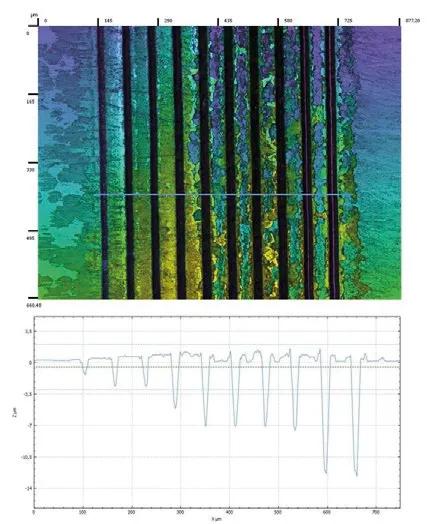 通過使用我們的S neox 3D光學(xué)輪廓儀,能夠輕松測量使用激光技術(shù)制造的微通道的形貌。使用20倍放大物鏡的共聚焦技術(shù),分析激光寫入過程中結(jié)構(gòu)輪廓的變化。