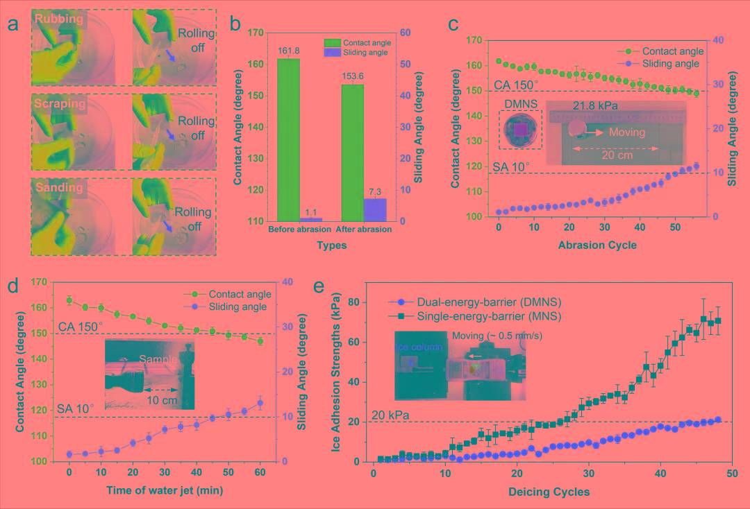 團隊采用超快激光分步脈沖注入與化學(xué)氧化復(fù)合的方法,制備出兩組不同類型的微納復(fù)合結(jié)構(gòu),分別對應(yīng)采用納米設(shè)計策略和雙能壘設(shè)計策略的四種超疏水表面。通過一系列防冰與除冰性能測試,發(fā)現(xiàn)相較于傳統(tǒng)的納米效應(yīng)單能壘超疏水結(jié)構(gòu),雙能壘結(jié)構(gòu)具有更高的Cassie穩(wěn)定性和更優(yōu)越的防除冰性能。在-15℃的低溫高濕環(huán)境下可以維持過冷液體不結(jié)冰至少27000s,且冰粘附強度僅為0.9 kPa,在連續(xù)48次連續(xù)除冰循環(huán)后仍能維持~ 20 kpa。同時,團隊開展了線性磨損、常/低溫高壓水沖擊等測試,證實了所制備的雙能壘結(jié)構(gòu)可以很好地抵抗外部機械損傷,并在靜態(tài)和動態(tài)環(huán)境中保持良好的防除冰性能。該工作證實了雙能壘結(jié)構(gòu)設(shè)計對提高超疏水表面Cassie狀態(tài)穩(wěn)定性與耐久性的可行性,為超疏水防除冰表面的設(shè)計及應(yīng)用提供了理論上與技術(shù)上的新路徑。
