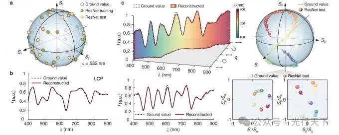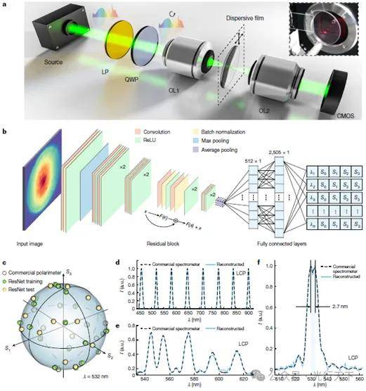 (a)實(shí)驗(yàn)光路示意圖,(b)所采用的深度殘差網(wǎng)絡(luò)示意圖,(c)高維光場(chǎng)探測(cè)方法的全斯托克斯偏振探測(cè)能力,(d)窄帶光譜探測(cè)能力,(e)寬帶復(fù)雜光譜探測(cè)能力,(f)光譜分辨能力