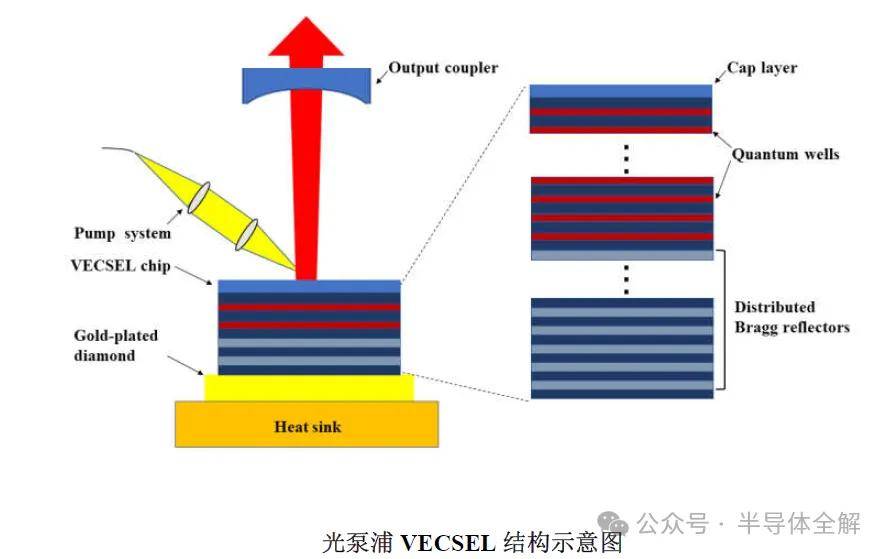 垂直外腔面發(fā)射激光器(VECSEL),也被稱為半導體碟片激光器(SDL),是一種相對較新的激光器家族成員。它可以通過改變半導體增益介質中量子阱的材料組分和厚度來設計發(fā)射波長,結合腔內倍頻可以覆蓋從紫外到遠紅外的廣泛波長范圍,在實現(xiàn)高功率輸出的同時保持低發(fā)散角圓形對稱激光光束。激光諧振腔由增益芯片底層DBR 結構和外部輸出耦合鏡構成。這種獨特的外部諧振腔結構可以在腔內插入光學元件實現(xiàn)倍頻、差頻、鎖模等操作,使VECSEL 成為從生物光子學、光譜學、激光醫(yī)療到激光投影等各種應用的理想激光源。
