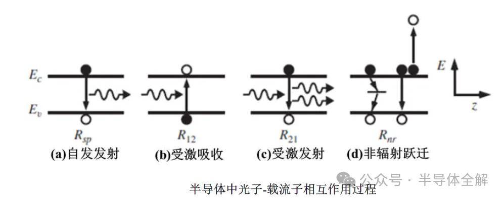 如果用專業(yè)的詞匯來介紹激光產生,位于激光諧振腔的增益介質受到泵浦光激勵將增益介質內電子激發(fā)到更高的能級,然后釋放光子回到低能級。下圖表示了能級之間的光子-載流子變化。高能級電子自發(fā)釋放能量躍遷到低能級,被稱為自發(fā)輻射(光子發(fā)射);低能級電子受到外部激勵,躍遷到高能級,被稱為受激吸收(光子吸收);高能級的電子受到外界光子泵浦,釋放出同頻光子,躍遷到低能級,被稱為受激發(fā)射(相干光發(fā)射);處于高能級的電子躍遷到低能級,產生的能量不以電磁輻射的形式釋放,被稱為非輻射躍遷。