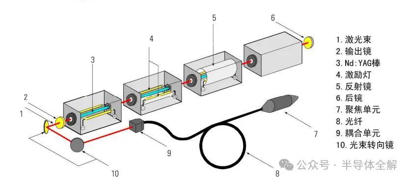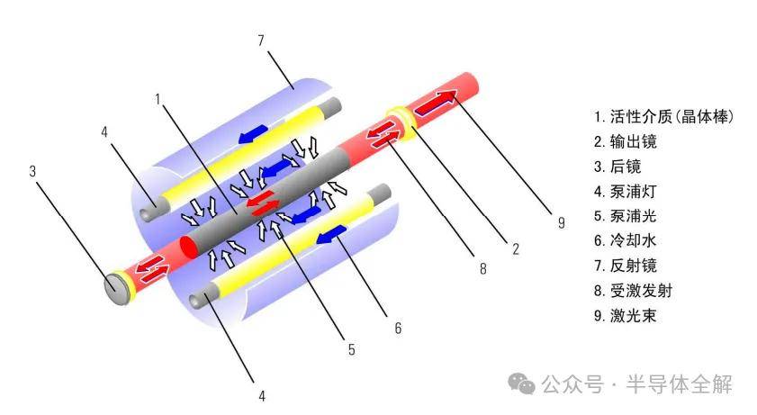 激光簡單理解就是一束光,這束光的亮度很亮,通過把光聚集在一起,可以形成很高的能量,產生這種能量的設備叫激光器,我們來看一張激光器的結構圖: