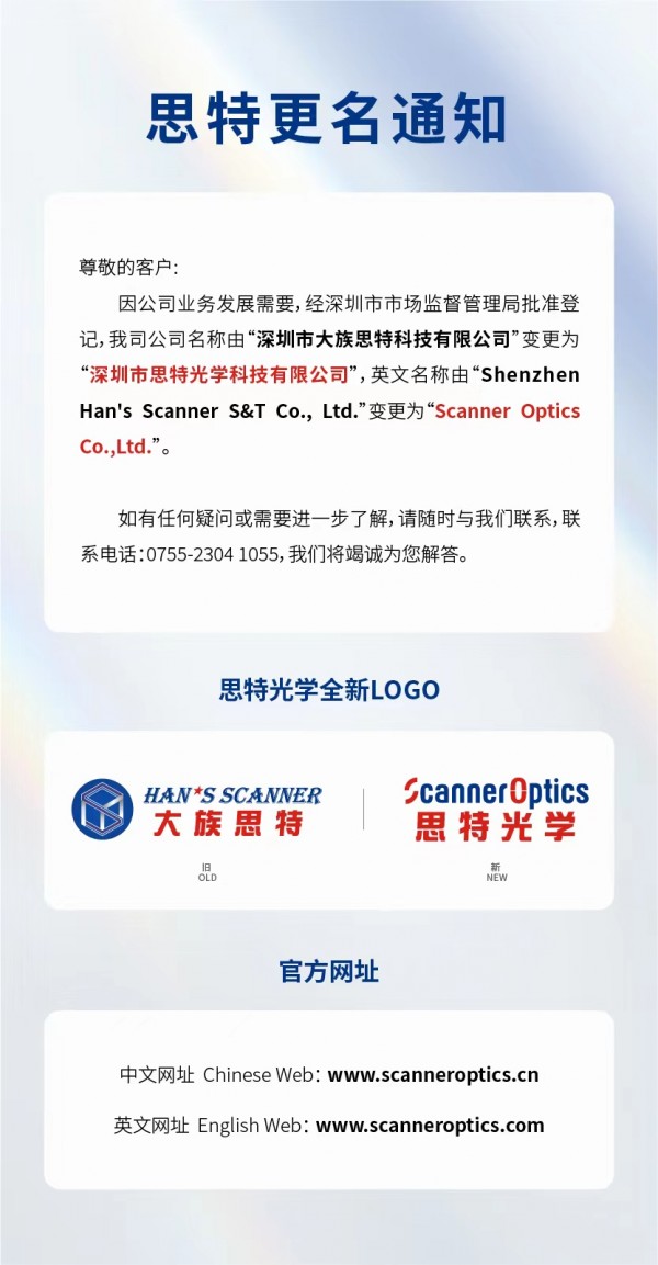 6月13日,大族思特發(fā)布公告稱,因公司業(yè)務(wù)發(fā)展需要,經(jīng)深圳市市場監(jiān)督管理局批準(zhǔn)登記,公司名稱由“深圳市大族思特科技有限公司”變更為“深圳市思特光學(xué)科技有限公司”,英文名稱由“Shenzhen Han's Scanner S&T Co.,Ltd.”變更為“Scanner OpticsCo.,Ltd.”。