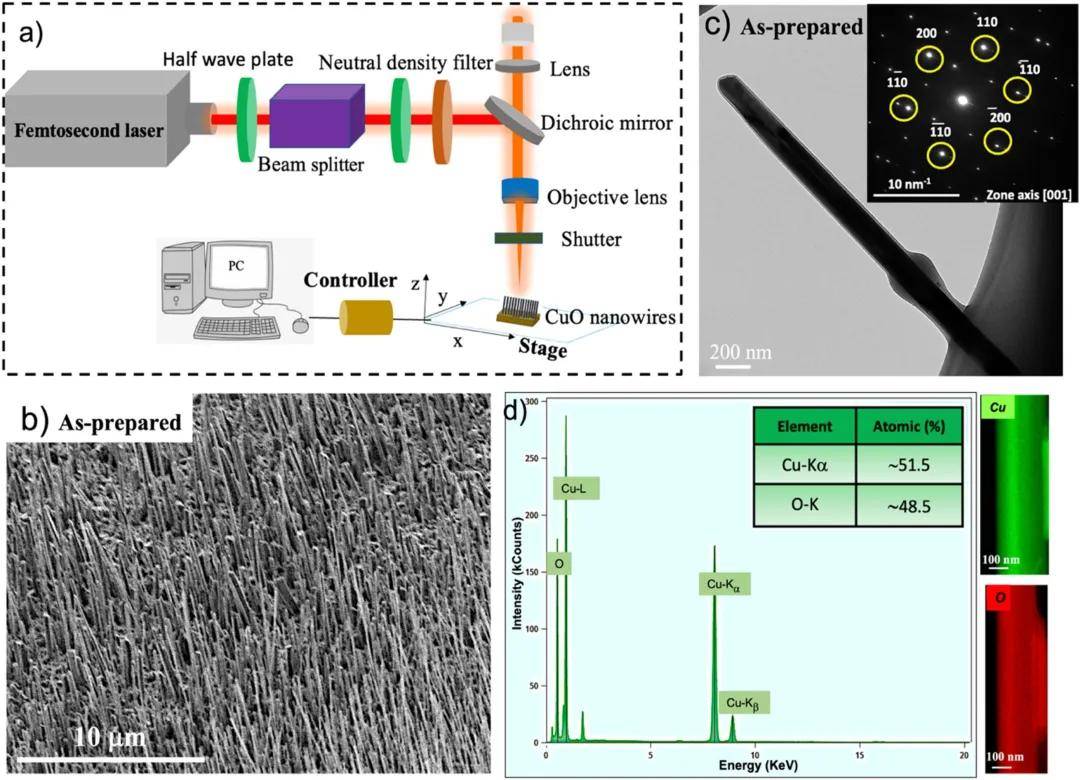 圖 1:a)飛秒脈沖激光輻照裝置示意圖;b)所制備納米線薄膜取向良好、垂直排列的SEM圖像;c,d)所制備單晶單斜CuO納米線的明場(chǎng)TEM 圖像,以及相應(yīng)的SAD圖樣和EDS分析。