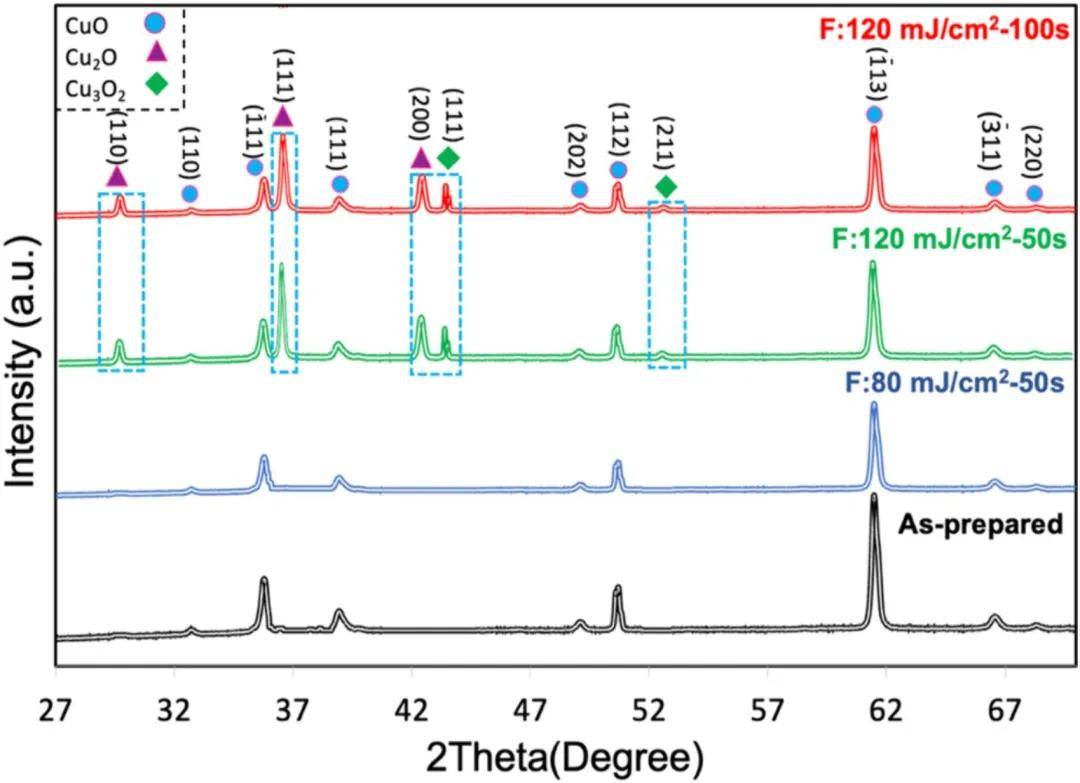 圖 4.XRD分析追蹤激光加工氧化銅納米線試樣相對(duì)于未加工試樣的結(jié)構(gòu)變化。