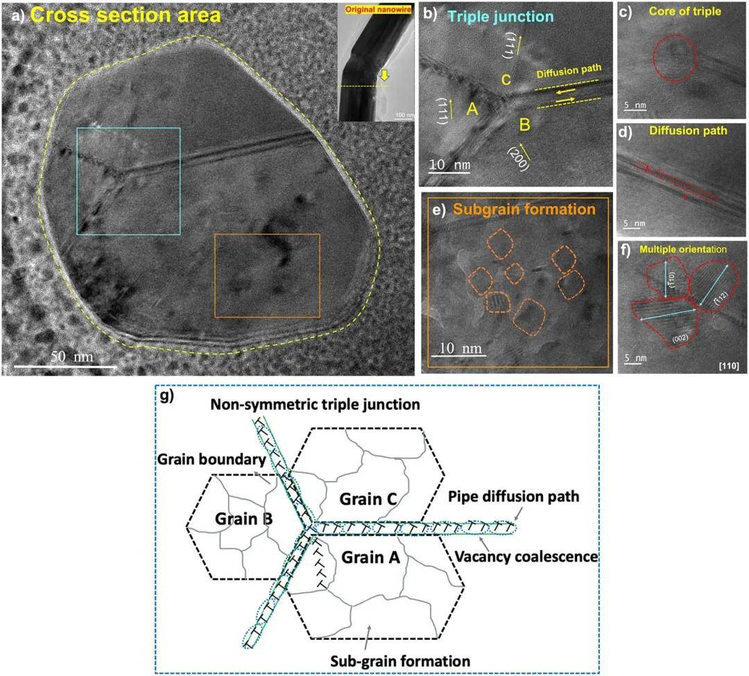 圖 6.在120 mJ/cm2的通量下激光照射50秒后彎曲納米線的TEM表征。