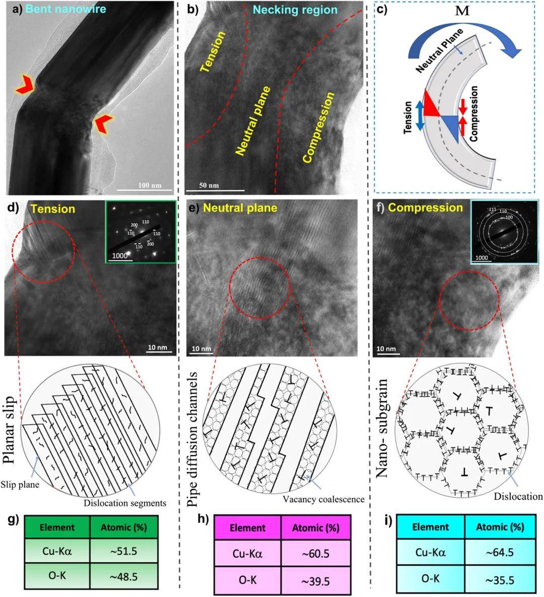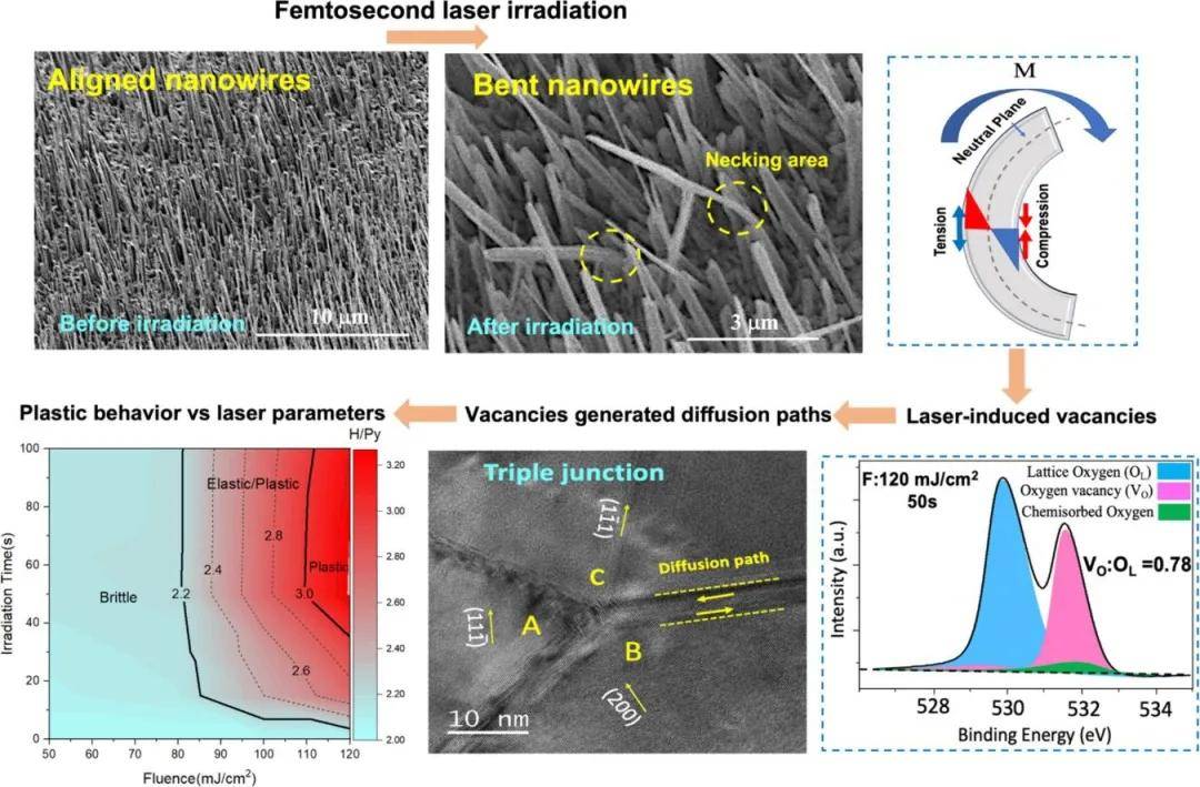 金屬氧化物納米線是制造納米器件(尤其是應(yīng)變傳感器)的理想材料。然而,這些材料的固有脆性限制了其應(yīng)用??蒲腥藛T證明,通過(guò)飛秒激光輻照進(jìn)行二次處理,可以解決這一限制。科研人員的研究表明,氧化銅納米線在室溫下的力學(xué)性能可以調(diào)節(jié),以減少脆性破壞并增強(qiáng)塑性??蒲腥藛T利用透射電子顯微鏡圖像研究了飛秒激光處理誘導(dǎo)塑性的微觀機(jī)制。在適度的激光輻照強(qiáng)度下,這種處理方法通過(guò)產(chǎn)生更高密度的氧空位來(lái)誘導(dǎo)氧化銅納米線的塑性,從而使納米線的構(gòu)型從斷裂變?yōu)閺澢?。在彎曲的納米線中,由于高應(yīng)變率,空位從彎曲拉伸區(qū)遷移到壓縮區(qū),導(dǎo)致局部激光誘導(dǎo)氧化銅向缺氧成分相變。飛秒激光誘導(dǎo)的氧空位凝聚為擴(kuò)散機(jī)制的激活鋪平了道路,而擴(kuò)散機(jī)制反過(guò)來(lái)又促進(jìn)了位錯(cuò)運(yùn)動(dòng),從而導(dǎo)致了亞結(jié)構(gòu)的發(fā)展。此外,納米壓痕分析還進(jìn)一步證明了飛秒加工納米線具有類似金屬的塑性行為。這一結(jié)果可用于提高納米線在未來(lái)應(yīng)用中的性能。