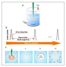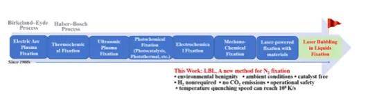 最近,中山大學(xué)楊國偉教授研究組提出了一種新穎的激光制造清潔能源技術(shù)即液相激光發(fā)泡(laser bubbling in liquids, LBL),為能源清潔轉(zhuǎn)化領(lǐng)域帶來了新的希望。LBL是以脈沖激光在液相中誘導(dǎo)形成微氣泡作為微反應(yīng)器來進(jìn)行化學(xué)反應(yīng)。泡泡內(nèi)的峰值溫度可高達(dá)上萬 K,同時(shí)微氣泡能夠?qū)崿F(xiàn)快速升溫和降溫,速率可達(dá)108 K/s。這顯然是一個(gè)遠(yuǎn)離熱力學(xué)平衡的狀態(tài),為化學(xué)反應(yīng)提供了一個(gè)極端的環(huán)境。許多在常態(tài)下需要借助催化劑才能進(jìn)行的化學(xué)反應(yīng),在小泡泡里面很容易就能發(fā)生。這種方法不僅不涉及任何催化化學(xué)過程(無需催化劑和復(fù)雜的催化反應(yīng)裝置),而且在常態(tài)下進(jìn)行,簡(jiǎn)單、清潔、高效(圖1)。很顯然,對(duì)于在催化化學(xué)以外的常態(tài)條件下,去探索簡(jiǎn)單、綠色、高效的清潔能源制造技術(shù)來說,LBL方法打開了一扇大門,同時(shí),也開辟出一條超越催化化學(xué)反應(yīng)的道路。目前,楊國偉教授研究組與柯卓鋒教授團(tuán)隊(duì)合作將LBL技術(shù)應(yīng)用于清潔能源制造,取得了一系列重要的研究進(jìn)展。