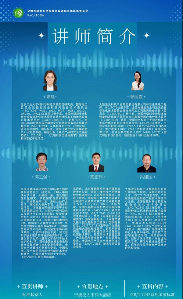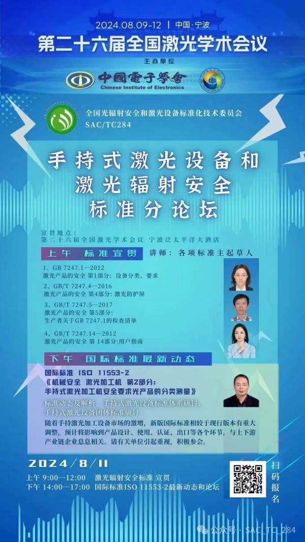 全國光輻射安全和激光設(shè)備標準化技術(shù)委員會與激光材料加工和激光設(shè)備分技術(shù)委員會將同期在第二十六屆全國激光學(xué)術(shù)會議舉辦GB7247系列國家標準宣貫“手持式激光設(shè)備和激光輻射安全標準分論壇”,深圳市激光智能制造行業(yè)協(xié)會和廣東省激光行業(yè)協(xié)會協(xié)辦。