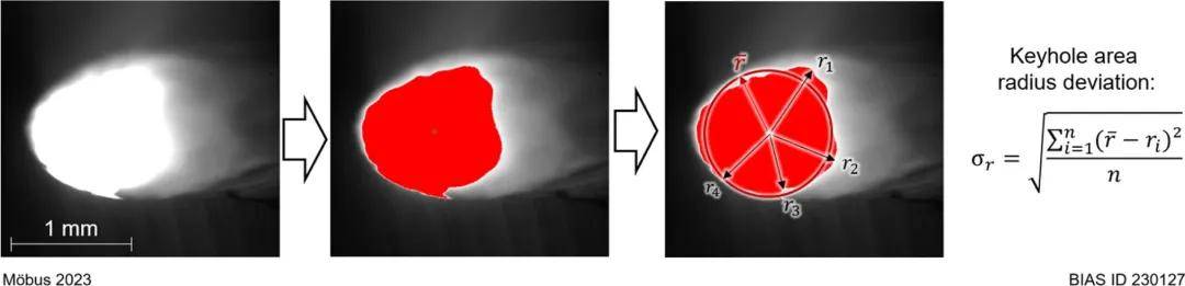 圖 5:左:用于測量鎖孔面積的高速視頻原始幀;左二:檢測到的鎖孔面積;右二:測量到的鎖孔面積;右:鎖孔面積半徑偏差的定義