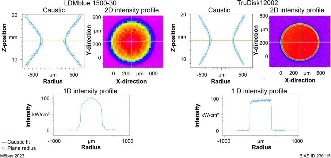 圖 1:所用激光束焦平面上測量到的焦散以及一維和二維強(qiáng)度曲線。