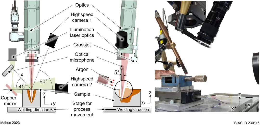 本研究使用波長為1030nm的紅外激光光束源和波長為445 nm的藍(lán)色激光光束源對(duì)2.4068 純鎳進(jìn)行了激光束深熔焊接試驗(yàn),這兩種激光光束的光束特性相當(dāng)。在每種情況下,都使用了兩種不同的激光功率,與使用各自其他波長焊接的樣品相比,焊接深度相同,以研究這樣一種假設(shè):激光波長的改變會(huì)改變鎖孔內(nèi)部的局部能量分布以及鎖孔動(dòng)態(tài),包括鎖孔開口的波動(dòng)、飛濺的形成、聲發(fā)射以及由此產(chǎn)生的孔隙率。通過金相分析和多傳感器設(shè)置(包括飛濺跟蹤、鎖孔面積跟蹤和機(jī)載聲發(fā)射測量)對(duì)實(shí)驗(yàn)進(jìn)行了監(jiān)測和比較,結(jié)果證實(shí)了這一假設(shè)。