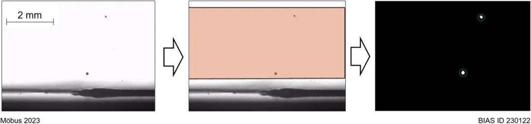圖 4:左:用于飛濺檢測的高速視頻原始幀;中心:確定的興趣區(qū)域;右:檢測到的飛濺