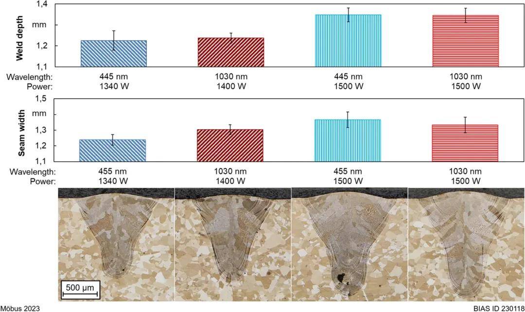 圖 6:隨激光功率和波長變化的平均焊縫深度(上圖)和平均焊縫寬度(中圖);特征金相橫截面(下圖)