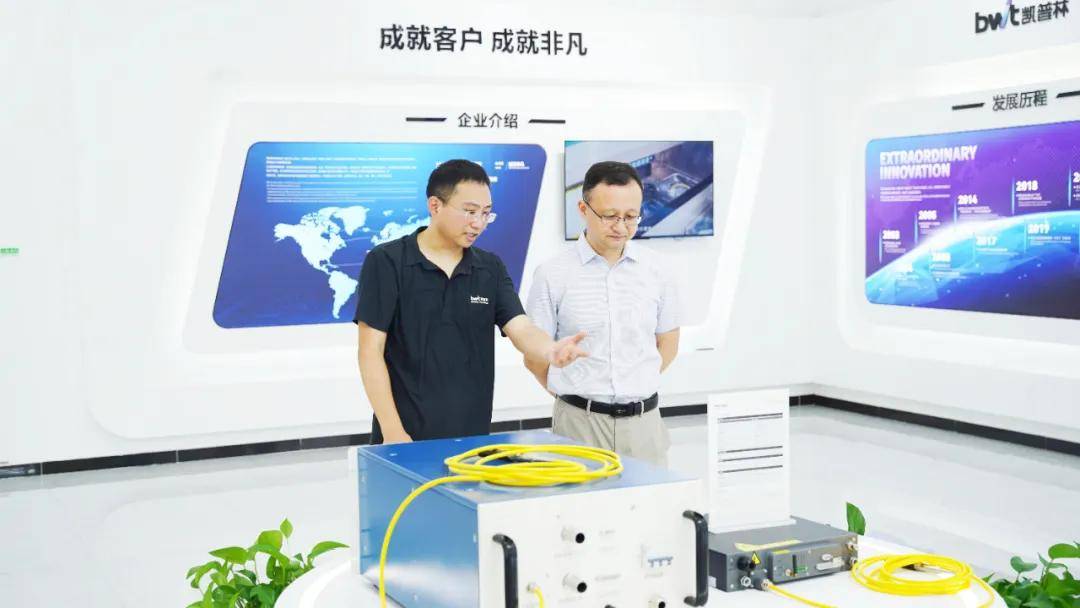 凱普林董事長陳曉華向白本鋒書記介紹公司激光器產品