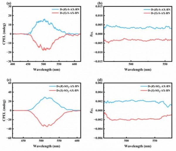圖4. CP-OLEDs性能:(a), (c) CPEL光譜; (b), (d) gEL-波長曲線。