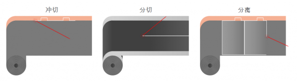 機(jī)器設(shè)計(jì)和電極制造方法以及電池單元的幾何形狀決定著切割策略,因此也是限制切割速度的主要因素。一般來(lái)說(shuō),電池箔的裁剪可采用不同類(lèi)型的切割工藝:沖切、分切和分離(見(jiàn)圖 2)。在本文中,我們將重點(diǎn)關(guān)注沖切工藝,因?yàn)樵摴に嚰瓤梢宰屛覀冇^察到裸露的金屬表面,也可以觀察到薄膜的整個(gè)涂覆區(qū)域。此外,這種工藝通常要求機(jī)器采用最高的卷對(duì)卷加工速度,因此是非常高效的飛行加工工藝。