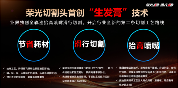 根據(jù)創(chuàng)鑫提供的2024年的激光器返修數(shù)據(jù)來看,由于噴嘴發(fā)燙、鏡片污染以及回光燒壞切割頭和激光器的故障的占比高達90%。對癥下藥,創(chuàng)鑫此次推出榮光系列,采用其獨創(chuàng)的“生發(fā)膏”技術(shù),這也是業(yè)界獨創(chuàng)全軌跡抬高噴嘴滑行切割,開啟行業(yè)全新的第二條切割工藝路線。