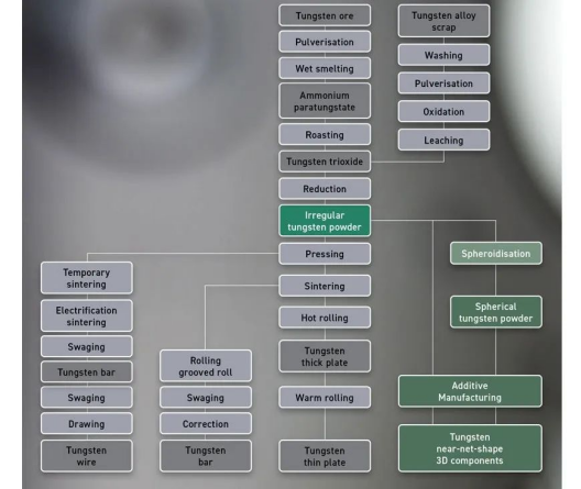 下圖展示了使用鎢礦石或鎢金屬?gòu)U料作為原材料的線材、棒材和板材生產(chǎn)的傳統(tǒng)路線以及較新的AM路線。對(duì)于鎢而言,傳統(tǒng)的熱熔技術(shù)(例如鑄造)幾乎不可能生產(chǎn)塊狀鎢金屬,這是因?yàn)?,在現(xiàn)有材料中,沒有足夠耐熱的固體材料可以安全且惰性地包裹熔融的鎢,使得通過這種常規(guī)方式加工鎢變得極為困難。