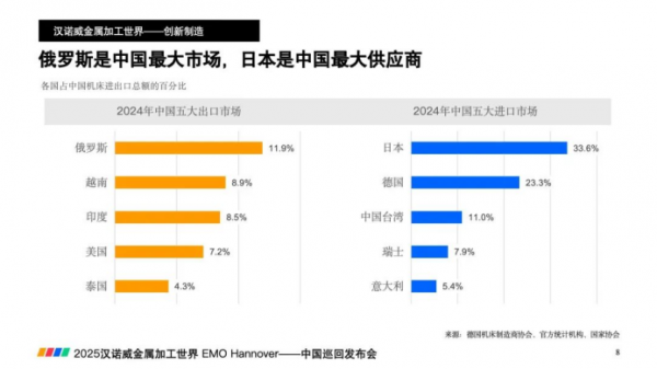 2024年,中國(guó)機(jī)床總產(chǎn)值約為290億美元,位居世界前列,是全球第一大生產(chǎn)國(guó)。機(jī)床出口約占總產(chǎn)量的29%,主要客戶(hù)群體分布于電氣、機(jī)械工程和汽車(chē)行業(yè)。對(duì)于金屬加工企業(yè)而言,機(jī)械工程和汽車(chē)制造行業(yè)是其核心需求方,因此也是EMO的主要專(zhuān)業(yè)觀眾。