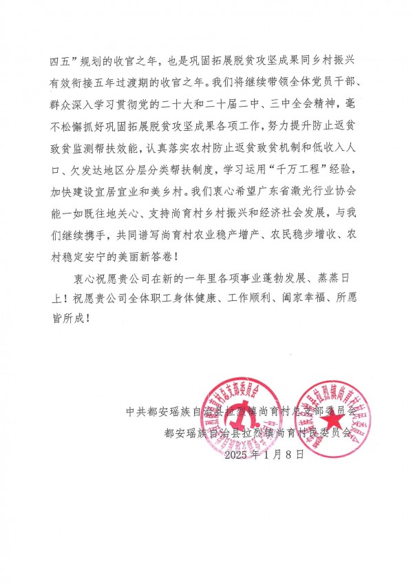 近日,廣東省激光行業(yè)協(xié)會(huì)收到了來自都安瑤族自治縣拉烈鎮(zhèn)尚育村村委及全體村民的深情感謝信。信中,尚育村對(duì)廣東省激光行業(yè)協(xié)會(huì)在推進(jìn)鄉(xiāng)村振興事業(yè)中所展現(xiàn)出的深厚情誼和無私奉獻(xiàn)表示了由衷的感激。