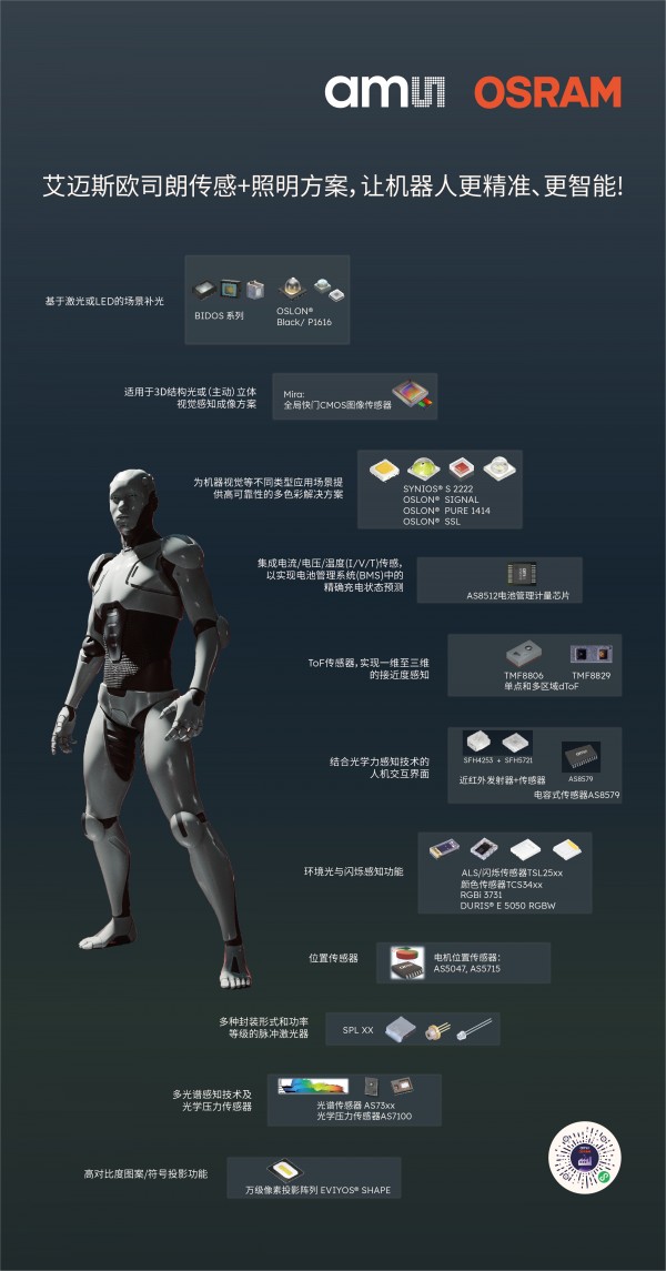 不僅如此,艾邁斯歐司朗憑借激光與LED場景補光、多封裝形式脈沖激光器、高精度全局快門傳感器、多光譜感知、ToF三維成像、BMS與光學力交互等尖端技術,賦能人形機器人對環(huán)境實現(xiàn)精確感知、交互和自主導航能力,加速科技成果的升級和轉(zhuǎn)化。